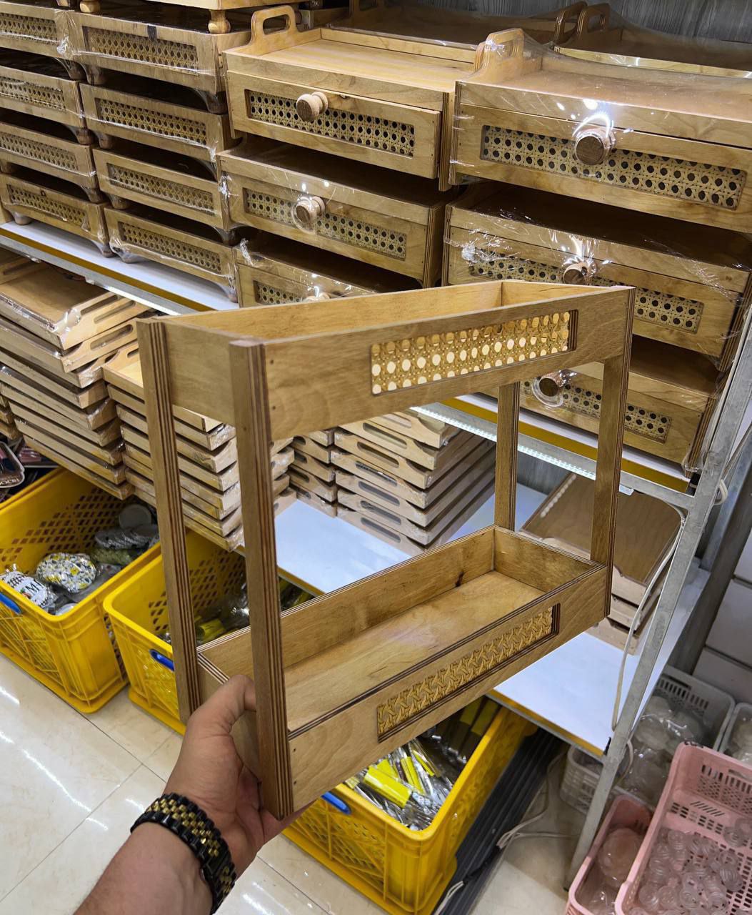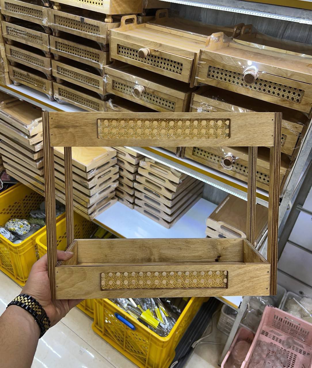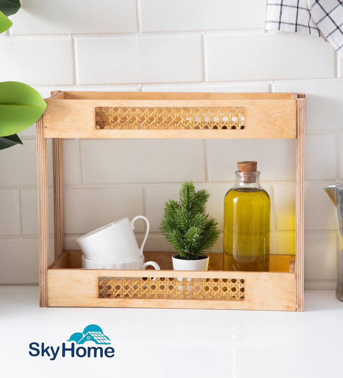استند دوطبقه از جنس چوب و حصیر بسیار شیک و جدیدترین نمونه بازار😍 مناسب جاادویه، ابزار چوبی اشپزخانه، روغن ریز و .. جنس چوب روس با روغن گیاهی، شیرینگ شده