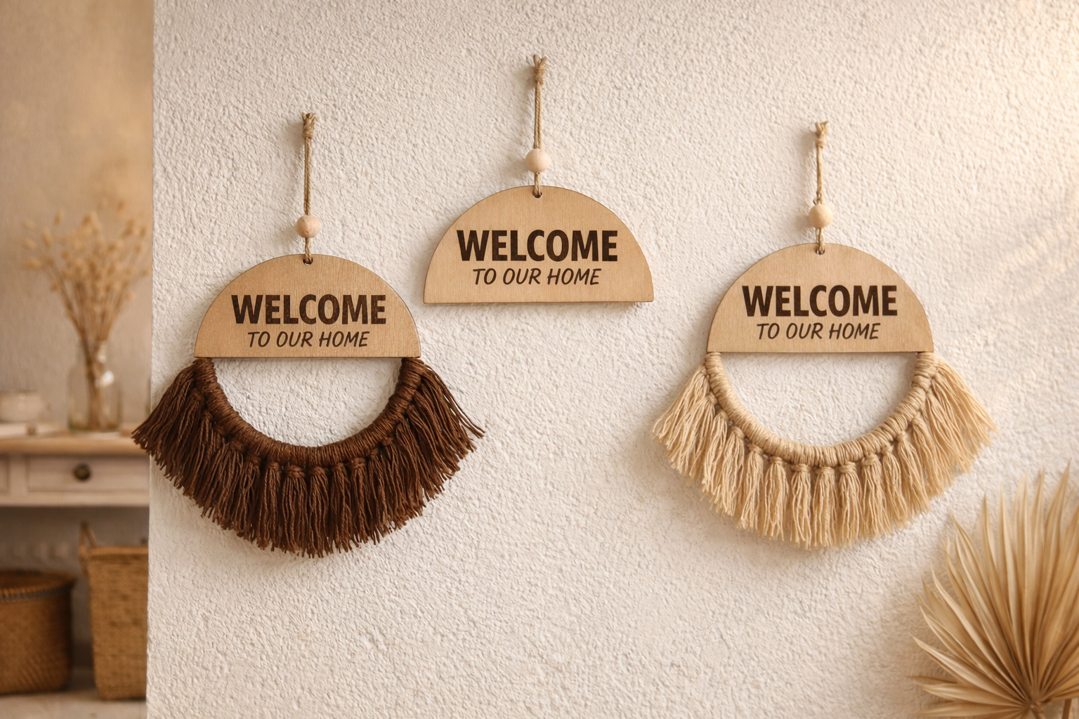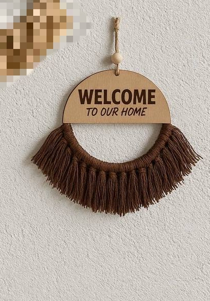 نوشتهی Welcome To Our Home روی پلاک چوبی، این آویز را به گزینهای جذاب برای درب ورودی یا هدیهای خاص برای خانهنو تبدیل کرده است.