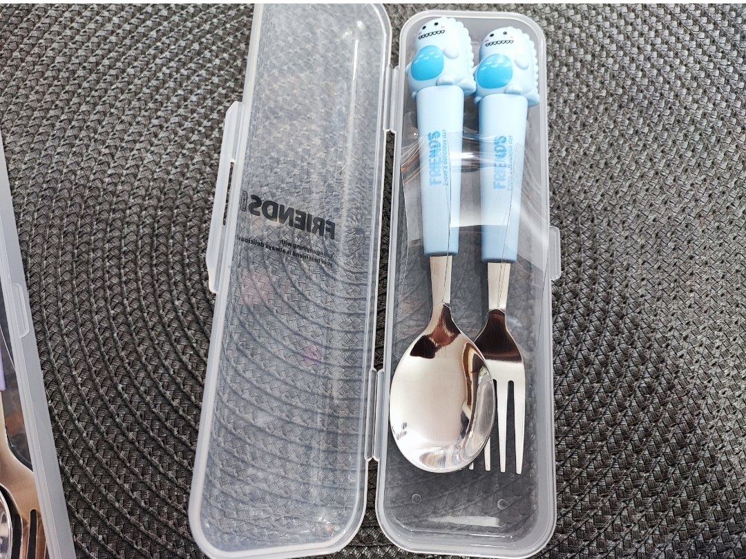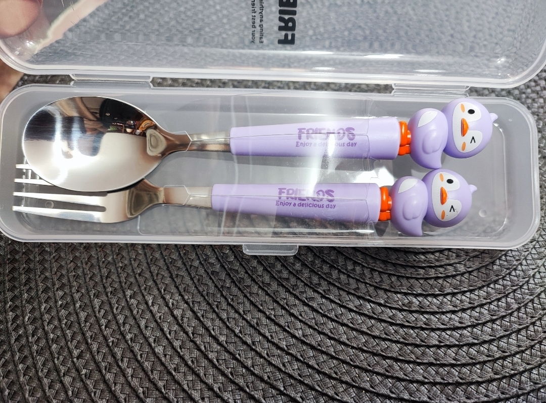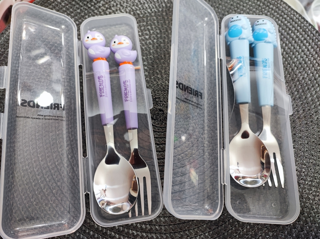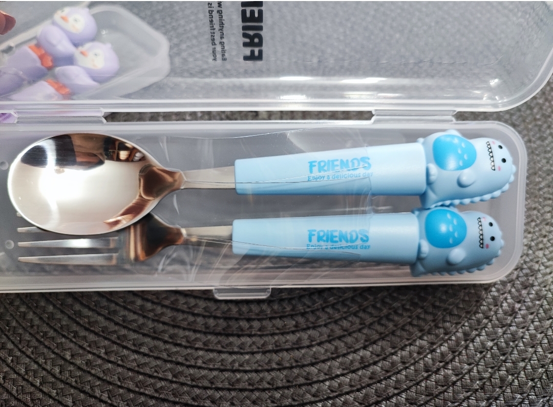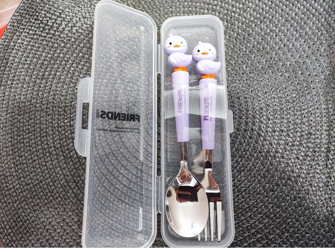 قاشق چنگال کودک با کیفیت عالی و ضخیم طوری طراحی شده که به دهان کودک آسیبی نمیزند، موجود در دورنگ آبی و بنفش