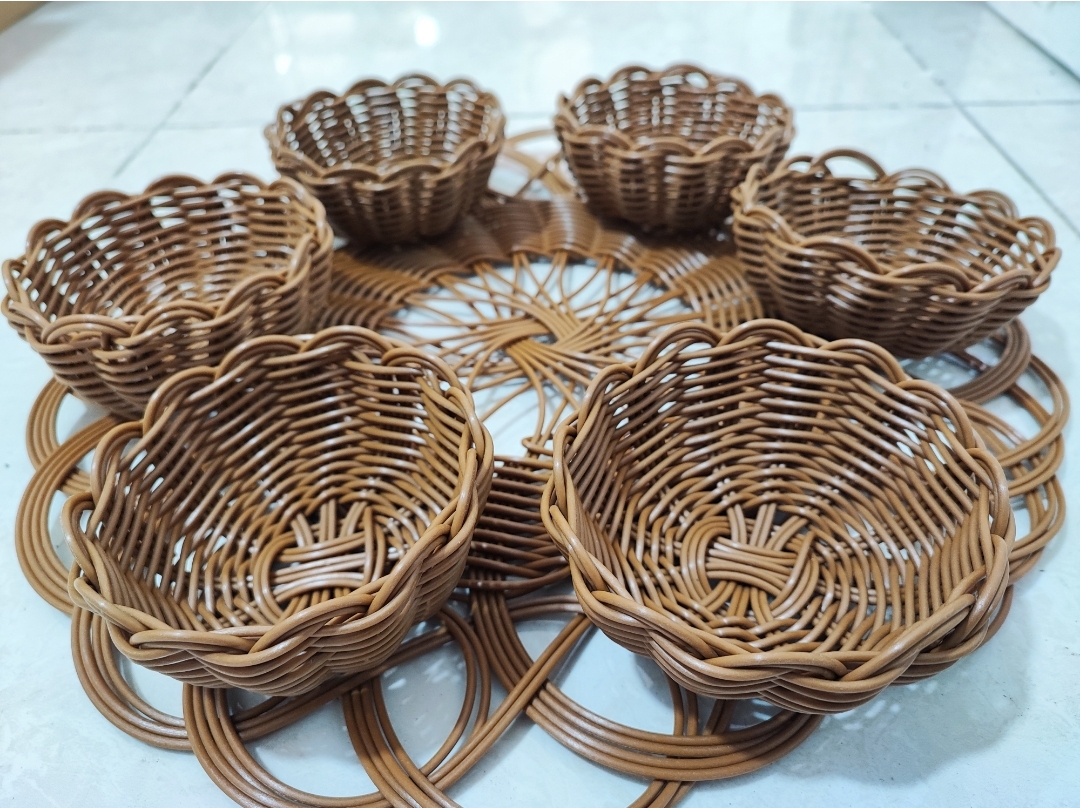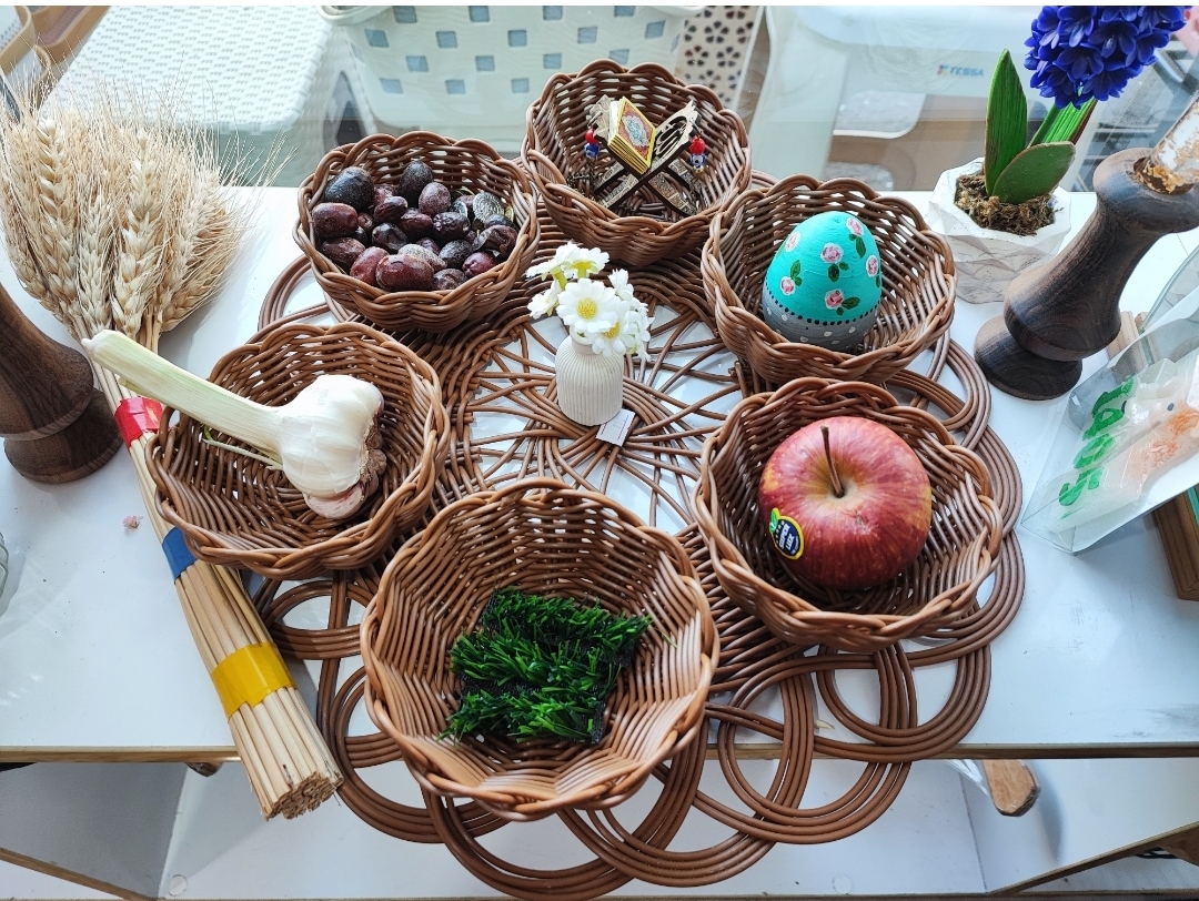 یه ست هفتسین شیک و زیبا که از جنس حصیری مفتولی میباشد. کار بسیار شیک و محکم. شامل زیره حصیری گرد بزرگ و شش عدد پیاله حصیری میباشد. این کار را با قیمت عالی از دست ندهید . موجودی محدود🪷
